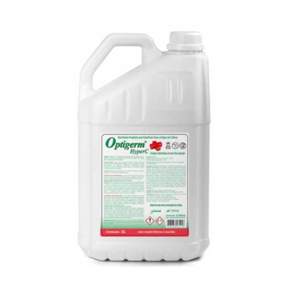 Optigerm HyperC é um limpador desinfetante para superfícies fixas e artigos não críticos de estabelecimentos de auxílio à saúde. Possui rápida ação e amplo espectro microbicida. Optigerm HyperC tem, como princípio ativo, a mistura de dois germicidas de reconhecida performance que, associados aos outros componentes da fórmula, apresentam comprovado efeito sinergético, onde a atividade da mistura supera o resultado esperado de cada componente isolado. Esse efeito sinergético é responsável, tanto pelo incomparável poder biocida do produto, quanto pelo efeito residual de 7 dias e atividade na presença de matéria orgânica, demonstrando-se superior em comparação a outros produtos que utilizam a mesma base de ativos. É uma opção extremamente econômica já que rende até 1:400 litros.