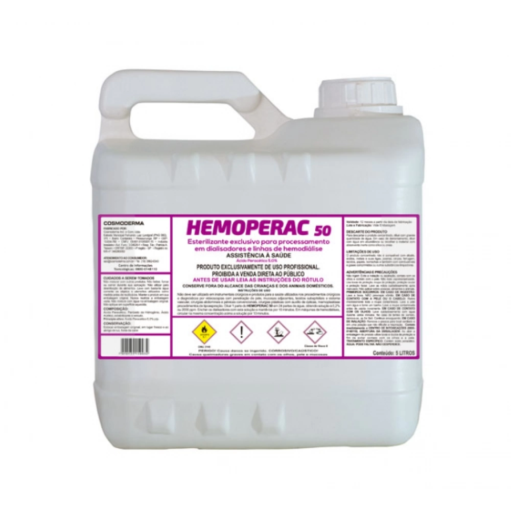 HEMOPERAC 50 – Indicado para esterilização química de dialisadores e máquinas de hemodiálise, formulado especialmente para apresentar alta efetividade na remoção de depósitos de Carbonato de Cálcio, Magnésio e resíduos orgânicos (ex: sangue). Eficaz na desincrustação de cristais de bicarbonato de sódio, não acarretando corrosividade aos equipamentos.